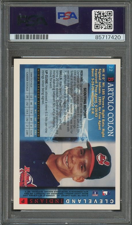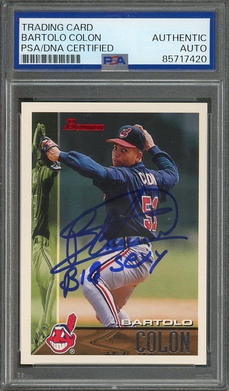 1995 Bowman Bartolo Colon RC #22 Autographed with Inscription PSA/DNA Authentic - This is a rookie of Colon, signed in blue sharpie, including his "Big Sexy" nickname inscription. Card and PSA holder are nice!