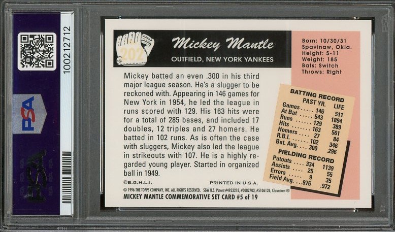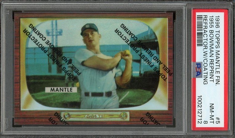1996 Topps Mantle 1955 Bowman Refractor #5 PSA NM/MT 8 - This auction is for the refractor version of the 1996 Topps Mantle reprints. Card still has the original protective coating and comes in a scratch free PSA holder.