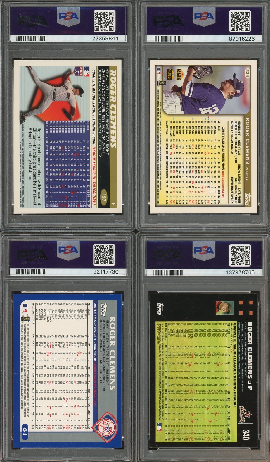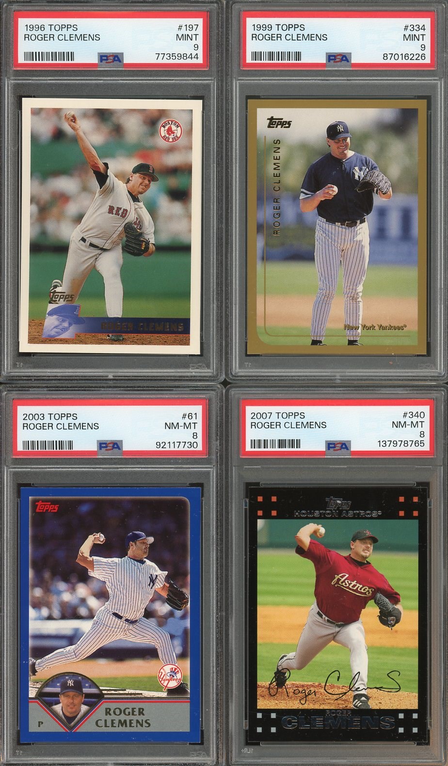 Lot of 4 Roger Clemens (1996, 1999, 2003, 2007) PSA Graded - The 1996 and 1999 Topps are both PSA?Mint 9’s, while the 2003 and 2007 Topps are both PSA?NM/MT?8’s.