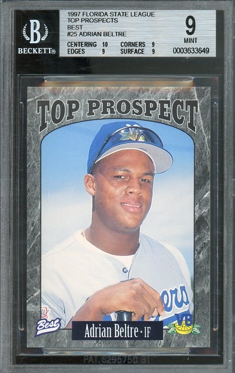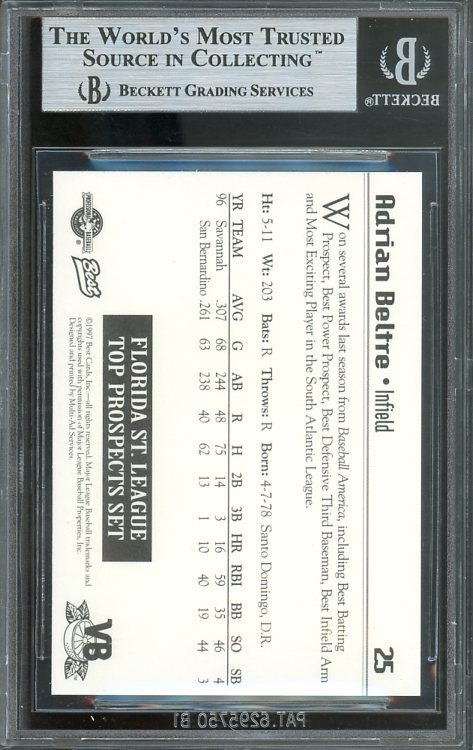 1997 Florida State League Adrian Beltre RC #25 BGS Mint 9 - Here is a very tough issue of Hall of Famer Adrian Beltre from 1997. This Florida State League issue is graded Mint 9 by Beckett and has a very low population.