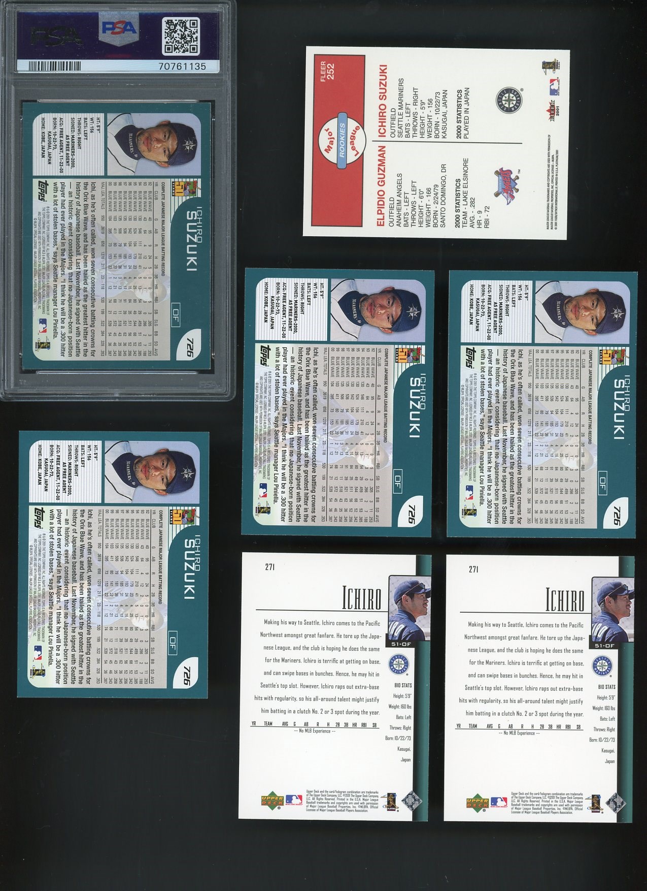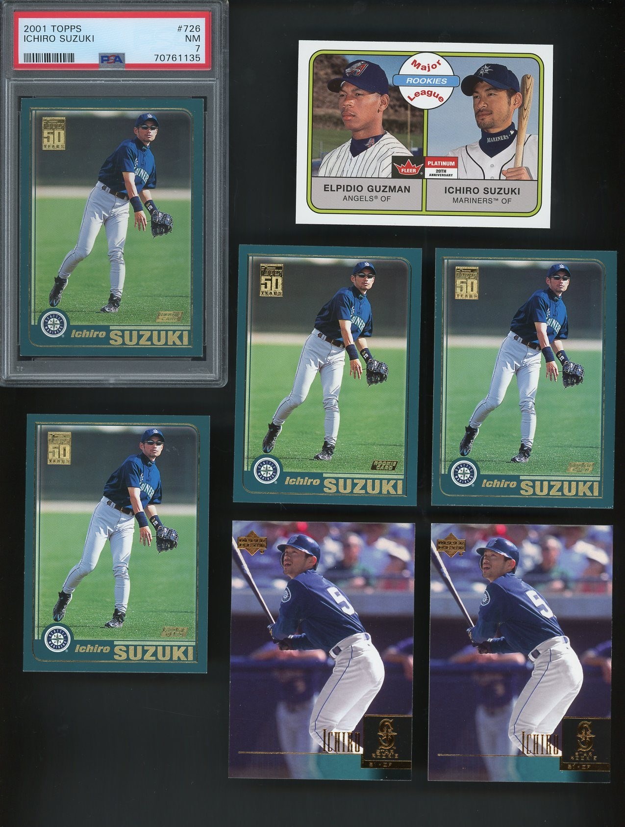 2001 Ichiro Suzuki Lot of 7 Rookies - Get four of his 2001 Topps RC #726, 2001 Fleer Platinum RC #252 and two of his 2001 Upper Deck RC #271.  Cards are NM or better.