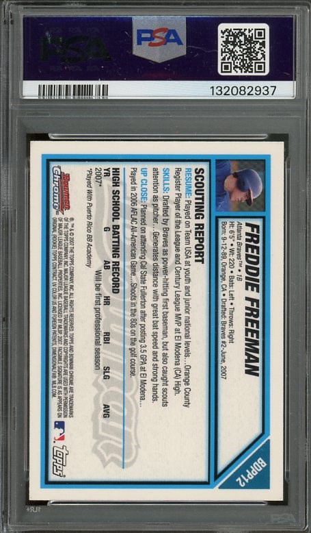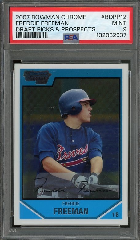 2007 Bowman Chrome Freddie Freeman RC #BDPP12  PSA Mint 9 - A hot card in the hobby, this Freddie Freeman card is his first Bowman Chrome offering.  A likely Hall of Famer someday.