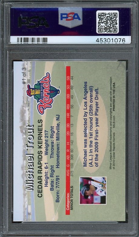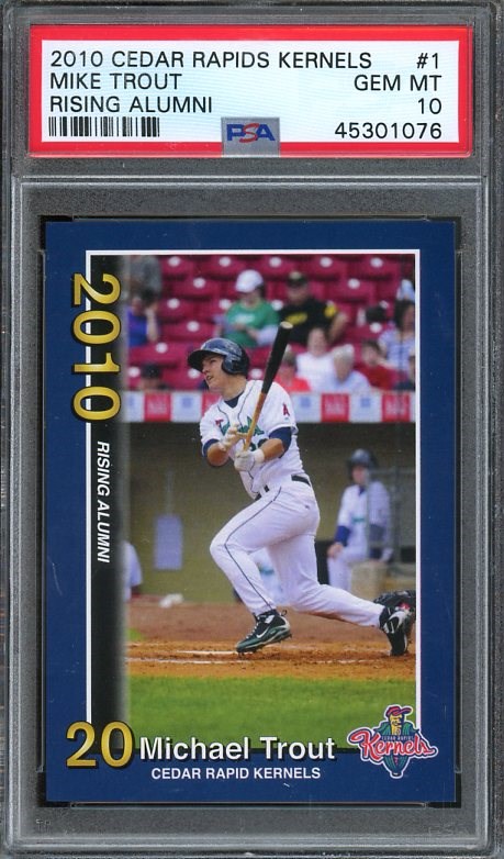 2010 Cedar Rapids Kernels Mike Trout #1 PSA GEM MINT 10 - The dark blue border makes this card condition sensitive. Here is a clean PSA 10 for your consideration.