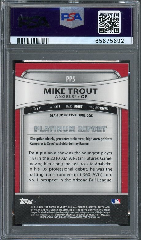 2010 Bowman Platinum Mike Trout RC #PP5  PSA MINT 9 - A great looking card with no issues.  Card comes in a scratch free PSA holder.