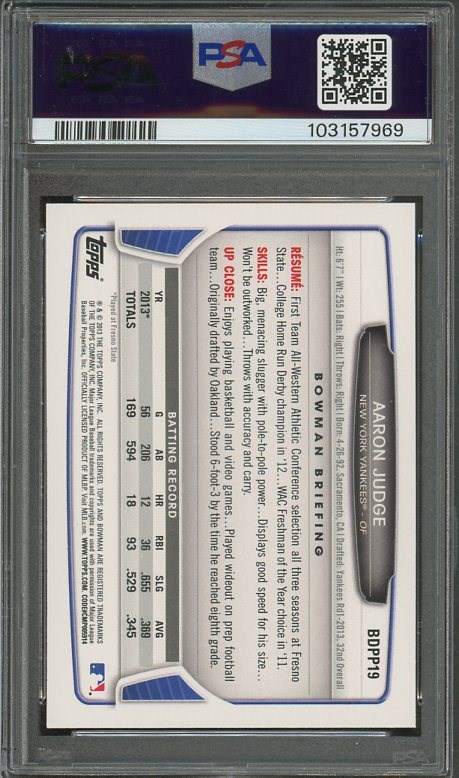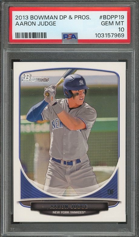 2013 Bowman Draft Picks Aaron Judge RC #BDPP19 PSA GEM MINT 10 - One of the must have Judge cards, this 2013 was the first MLB release of an Aaron Judge card. This one is gem!