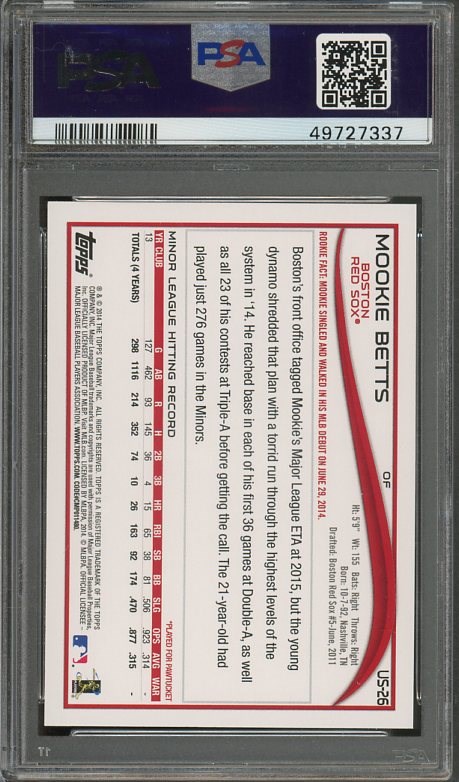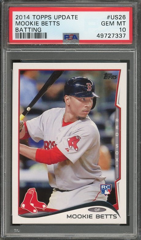 2014 Topps Update Mookie Betts RC #US26 (Batting)  PSA GEM MINT 10 - This is one of Betts better rookie cards.  A limited production, this Topps Update is in Gem Mint 10 condition.