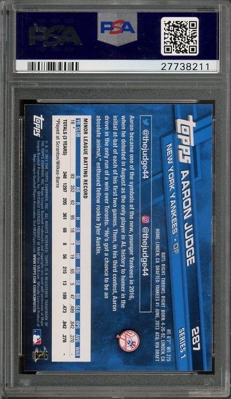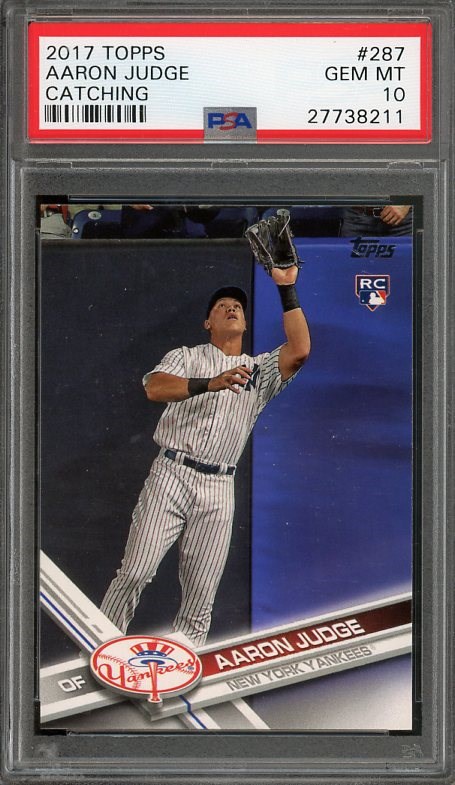 2017 Topps Aaron Judge RC #287 (Catching) PSA GEM MINT 10 - For the Topps collector, here is Judge's base rookie in Gem Mint condition. A must have item if you are building a Topps collection.