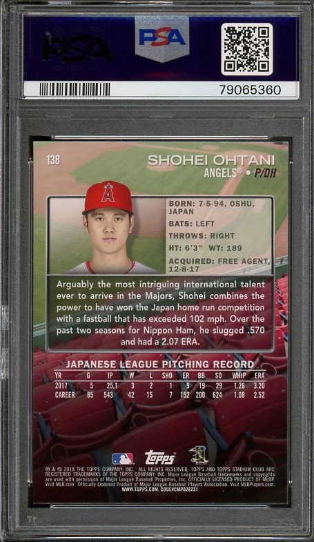2018 Stadium Club Shohei Ohtani (At Podium) RC #138  PSA GEM MINT 10 - This is Ohtani's base Stadium Club rookie card graded Gem Mint 10 by PSA.  Card and holder are problem free.