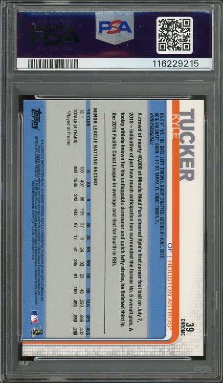 2019 Topps Chrome Kyle Tucker RC #39  PSA GEM MINT 10 - Tucker's rookies have become a popular item in the last year.  Here is a PSA 10 in a clean PSA holder.