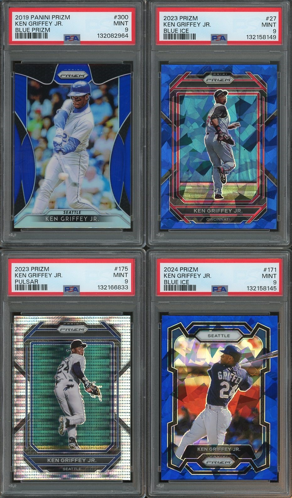 Ken Griffey, Jr. Lot of 4 Prizm Parallels (2019-2024)  All PSA MINT 9's - Highly attractive cards, all in mint condition.  A great way to expand your Griffey, Jr collection.