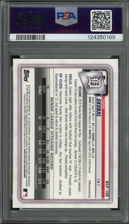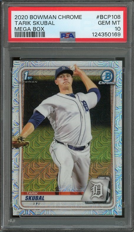 2020 Bowman Chrome Tarik Skubal Mega Box RC #BCP108 PSA GEM MINT 10 - Skubal has been one of the hottest pitchers in baseball over the last couple of years. Here is a great Mega Box rookie in PSA 10 grade.