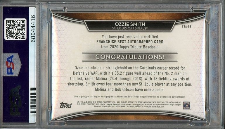 2020 Topps Tribute Ozzie Smith Franchise Best Autographs Orange (#'d/25)  PSA MINT 9 - A great looking card with a great Ozzie Smith autograph.  This orange parallel is limited to 25 produced.