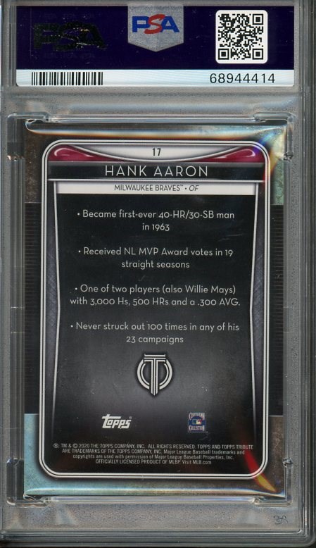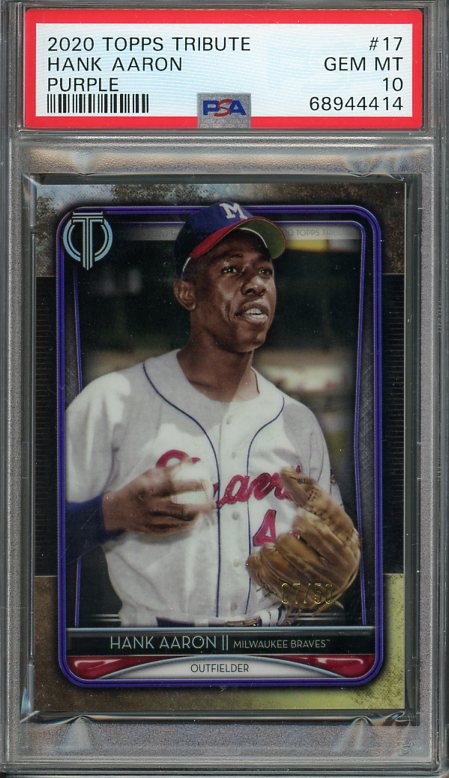 2020 Topps Tribute Hank Aaron Purple Parallel #'d/50 PSA GEM MINT 10 - Card is limited to 50 made and is graded a Gem Mint 10 by PSA. A very tough card!