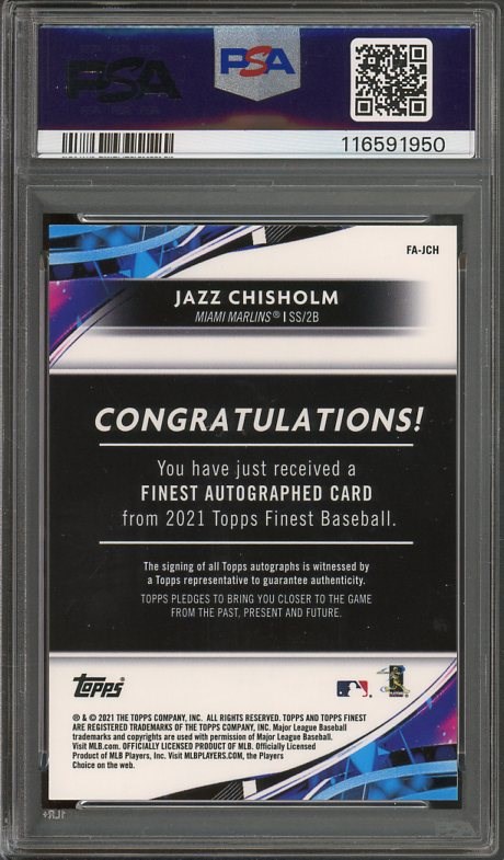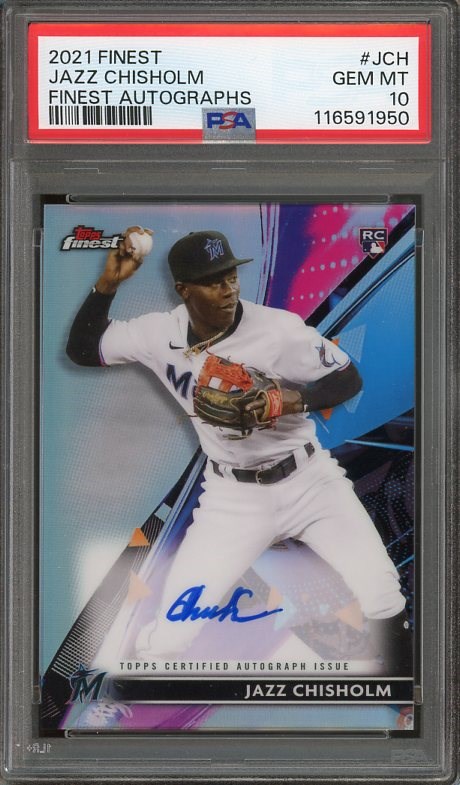 2021 Finest Jazz Chisholm Rookie Autographs #JCH PSA GEM MINT 10 - Here is a quality rookie autograph issued by Topps Finest in 2021. This rookie of Chisholm is a Gem Mint 10!