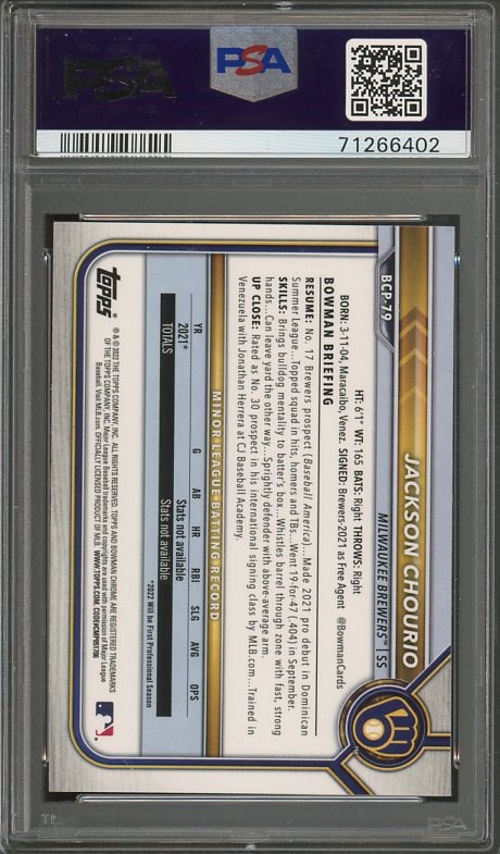 2022 Bowman Chrome Prospects Jackson Chourio RC #BCP79 PSA GEM MINT 10