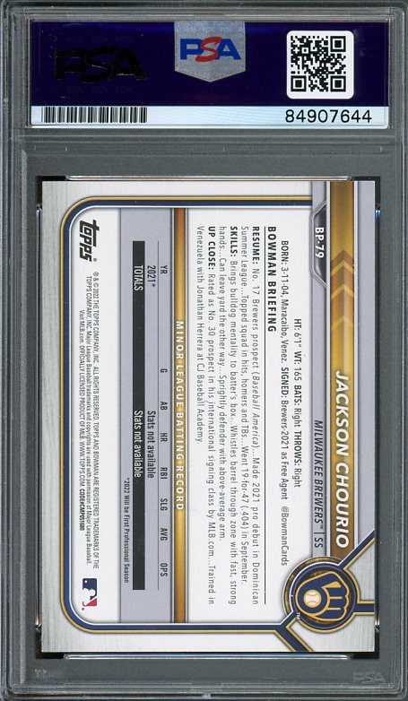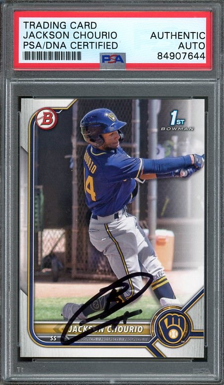 2022 Bowman Prospects Jackson Chourio RC #BP79 Autographed PSA/DNA Authentic - Chourio signed this 2022 Bowman rookie in, bold, black sharpie. Signature is authenticated by PSA/DNA.