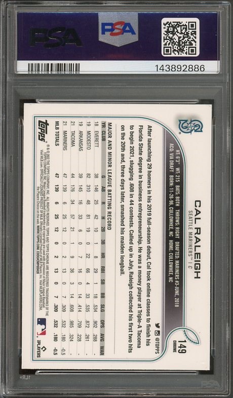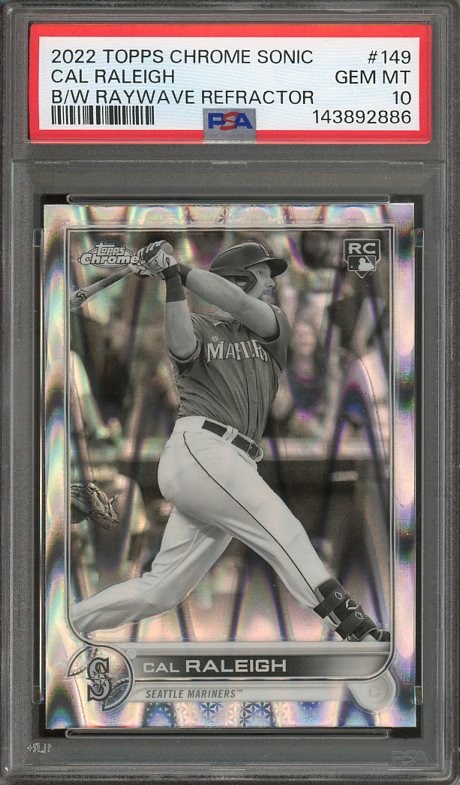 2022 Topps Chrome Sonic Cal Raleigh Black & White Raywave Refractor RC #149 PSA GEM MINT 10 - This Topps Chrome Raywave Refractor is a tough rookie of Cal Raleigh. This is a low PSA 10 pop card!