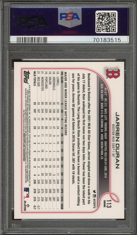 2022 Topps Chrome Jarren Duran X-fractor RC #113 PSA GEM MINT 10
