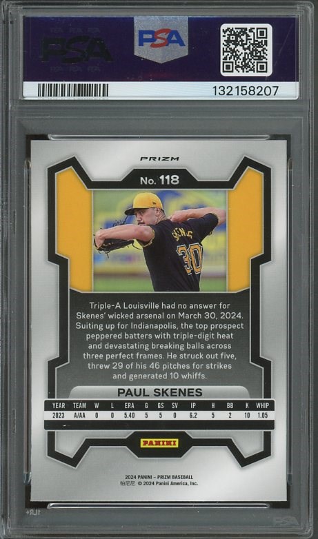 2024 Panini Prizm Paul Skenes Blue Ice Prizm RC #118 PSA GEM MINT 10 (Pop 25)