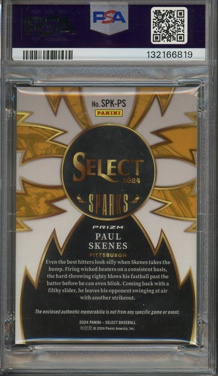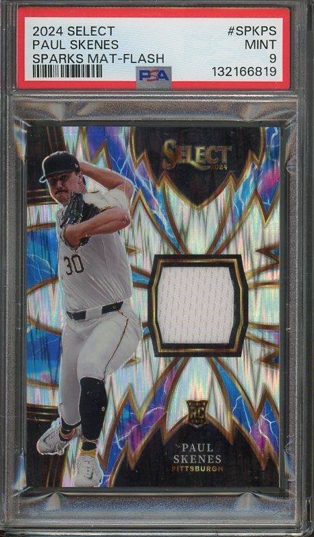 2024 Panini Select Paul Skenes Sparks Materials Flash Prizm #SPKPS PSA MINT 9 - A rookie year relic card of Skenes, this PSA Mint 9 is starting at just $20!