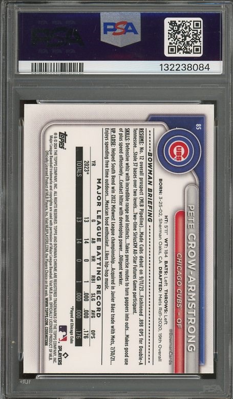 2024 Bowman Chrome Mega Box Pete Crow-Armstrong RC #85 PSA GEM MINT 10 - This Mega Box rookie card of Crow-Armstrong has been hot since last summer. Be sure to consider this one for your collection!