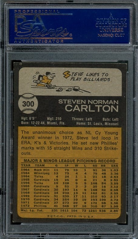 1973 Topps Steve Carlton #300 PSA NM/MT 8 - Carlton won four Cy Young Awards and two World Series during his Hall of Fame career. Here is a high grade 1973 Topps PSA NM/MT 8.