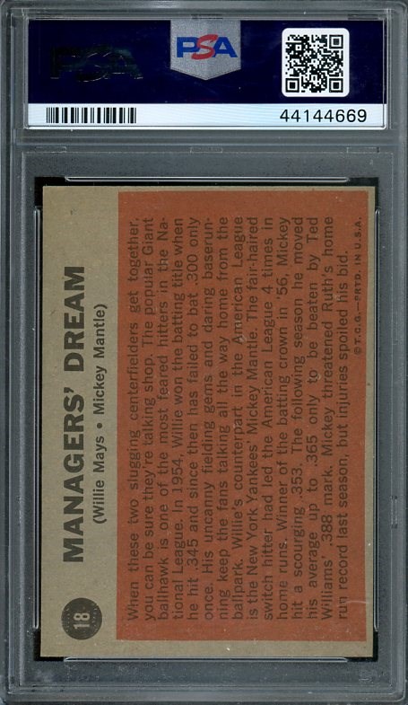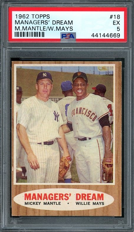 1962 Topps Managers' Dream Mickey Mantle/Willie Mays #18 PSA EX 5 - This iconic card features Mickey Mantle and Willie Mays in their prime. A closer look shows Hank Aaron, Elston Howard and John Roseboro in the background. The photo was taken at the 1961 All-Star Game.