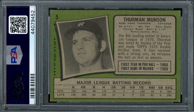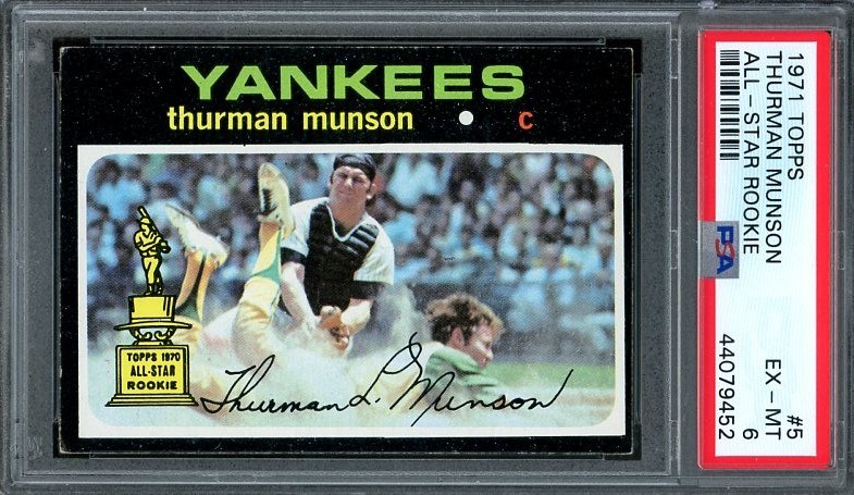 1971 Topps Thurman Munson #5  PSA EX/MT 6 - A very condition sensitive card and one of the most desired Munson cards that exists, is the 1971 Topps card. Here is a PSA EX/MT 6 that comes in a clean holder.