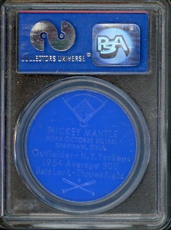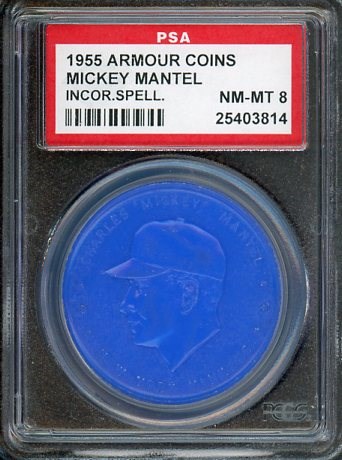 1955 Armour Coins Mickey Mantle (Spelled Mantel)  PSA NM/MT 8 - A high grade item with very few graded higher than this PSA 8.  This 1955 Armour Coin has Mantle's name incorrectly spelled as Mantel.  A great item for the Mantle collector.