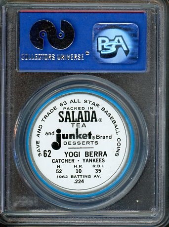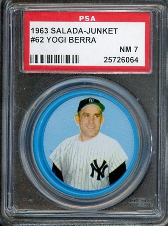 1963 Salada-Junket Coins Yogi Berra #62  PSA NM 7 - This Berra coin looks brand new and is deserving of the near mint PSA 7 grade.  Coin comes in a scratch free PSA holder.