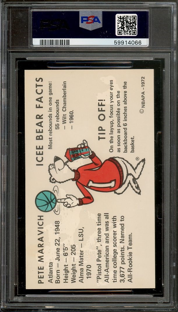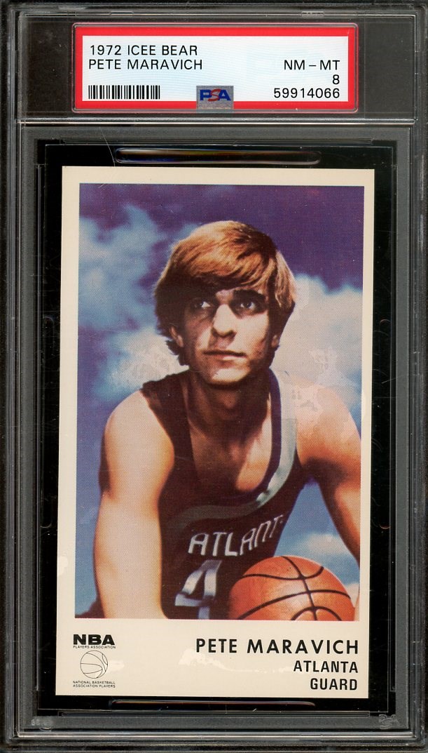 1972 ICEE Bear Pete Maravich PSA NM/MT 8 - Limited distribution made these ICEE Bear cards tough to find in certain regions of the country. Here is a high grade, PSA 8 of Maravich.