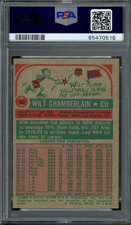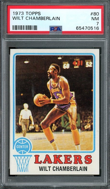 1973 Topps Wilt Chamberlain #80 PSA NM 7 - Here is a near mint card of Chamberlain on his last Lakers issue. Wilt's dominance still shows today as he retains several NBA records.