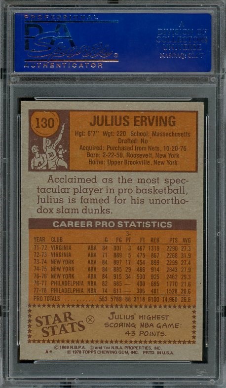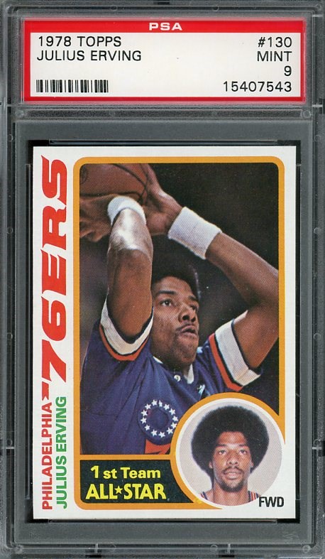 1978 Topps Julius Erving #130 PSA MINT 9 - Mint all around, this card does not disappoint! A high end card in a scratch free holder.