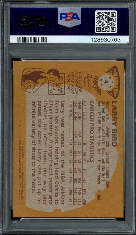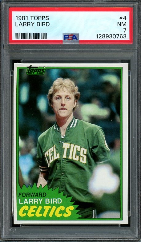 1981 Topps Larry Bird #4 PSA NM 7 - This is Bird's first solo card, appearing in the 1981 Topps set. The card is near mint and comes in a scratch free PSA holder.