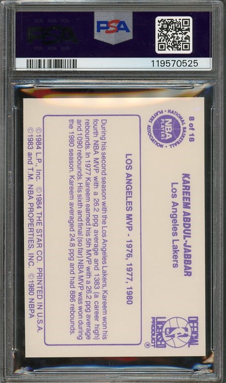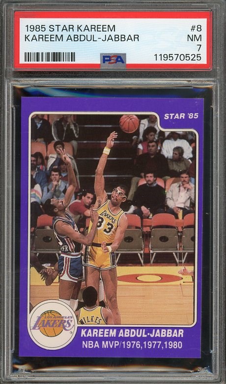 1985 Star Kareem Kareem Abdul Jabbar #8 PSA NM 7 - This card is from the 1985 Star Abdul-Jabbar set featuring eighteen different cards of Kareem. This one is a near mint PSA 7.