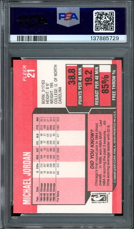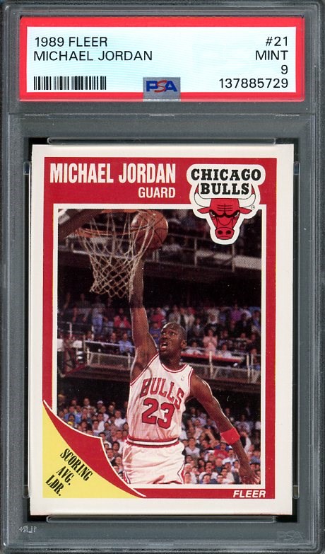 1989 Fleer Michael Jordan #21 PSA MINT 9 - An early card of Jordan, being his fourth Fleer issue. This one is mint, graded by PSA and comes in a clean holder.