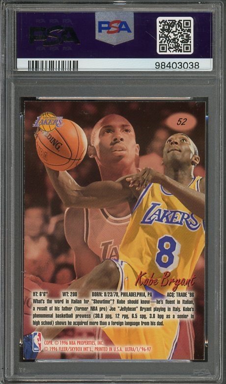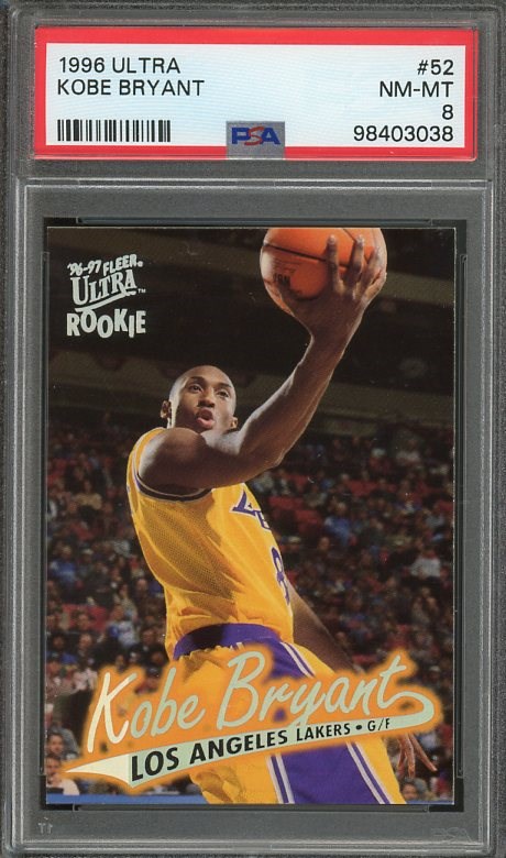 1996 Ultra Kobe Bryant RC #52 PSA NM/MT 8 - The Ultra Kobe rookie card is emerging as a collector favorite, with larger value appreciations compared to most of his other rookies.