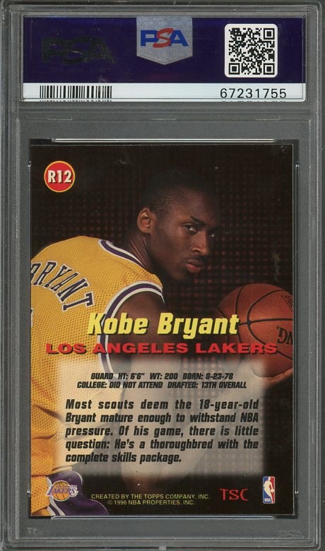 1996 Stadium Club Kobe Bryant Rookies #R12 PSA MINT 9 - Graded a Mint 9 by PSA, this is a Kobe rookie that had less production than his Upper Deck, Topps or Hoops issues.