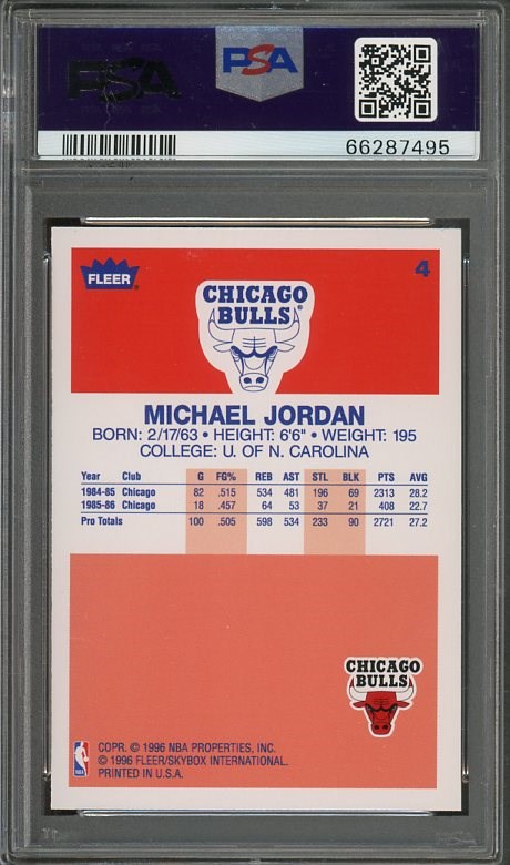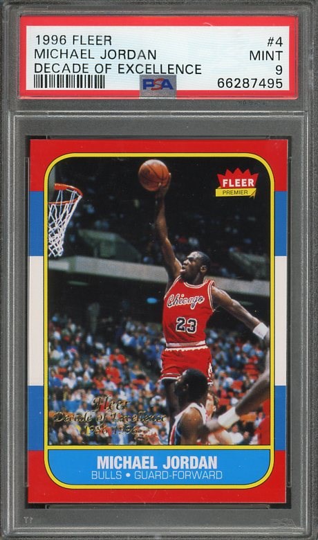 1996 Fleer Michael Jordan Decade of Excellence #4 PSA MINT 9 - If a PSA 9 of Jordan's rookie is out of your budget, here is a great alternative at a fraction of the cost. Card and holder are problem free.