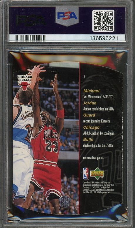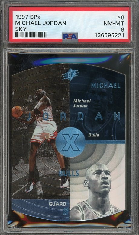1997 SPX Michael Jordan Sky Parallel #6 PSA NM/MT 8 - This Sky Blue parallel is tougher than his base card. The back of these are very condition sensitive, making this PSA 8 highly attractive.