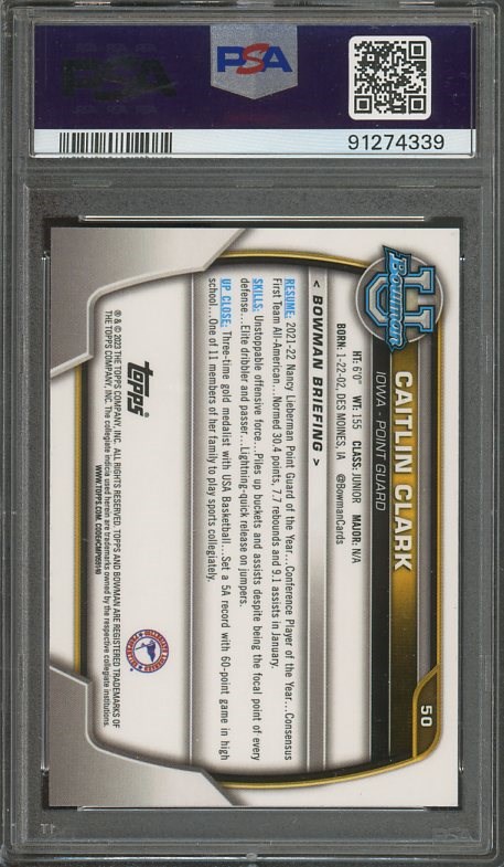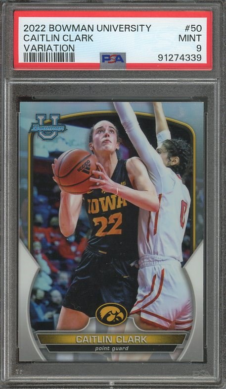 2022 Bowman University Chrome Caitlin Clark Short Print Photo Variation RC #50 PSA MINT 9 - This photo variation is a very tough card! This is the type of card you are really happy to own ten years down the road.