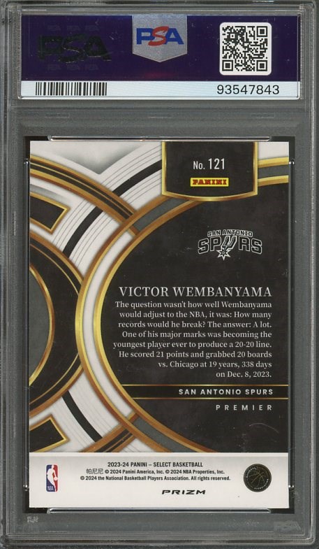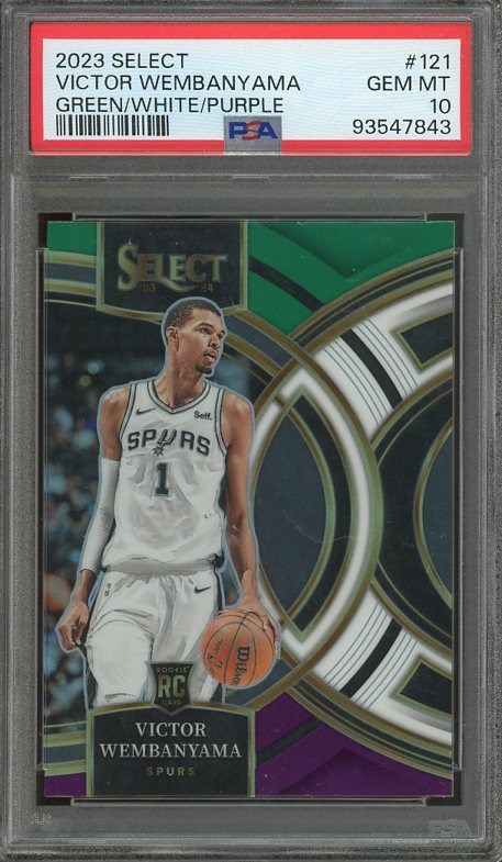 2023 Panini Select Victor Wembanyama Green/White/Purple Prizm RC #121 PSA GEM MINT 10 - Wemby is one of the most exciting players in the game today. Make sure you own at least one of his rookie cards.
