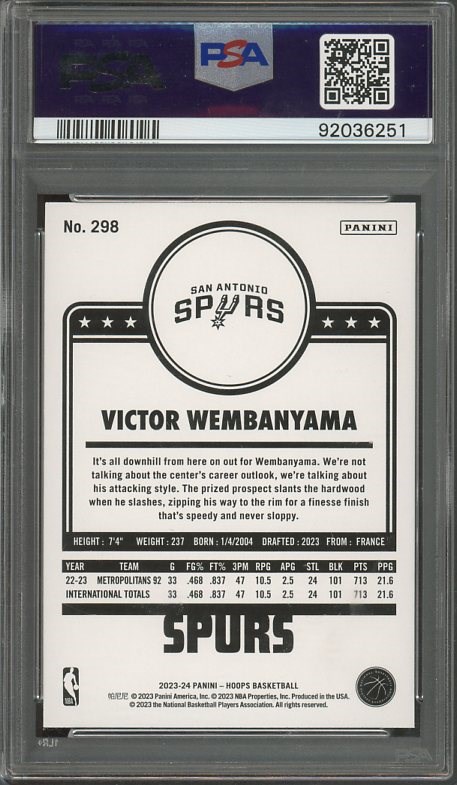 2023 Panini Hoops Victor Wembanyama RC #298 PSA GEM MINT 10
