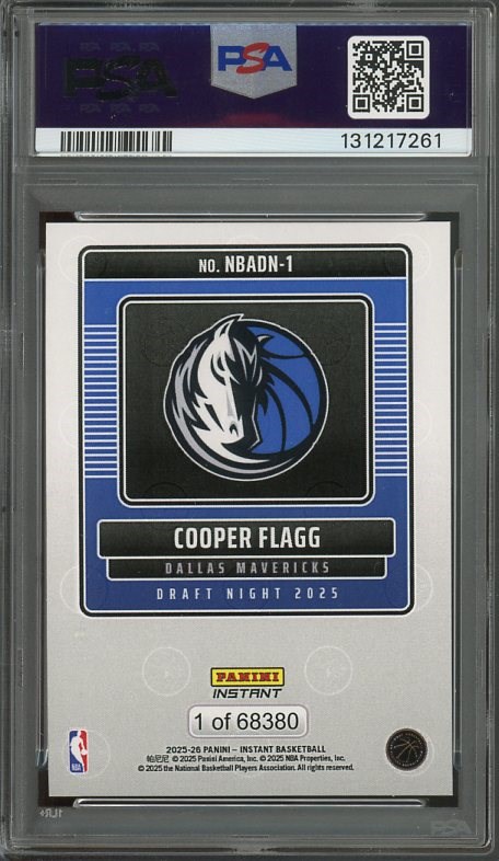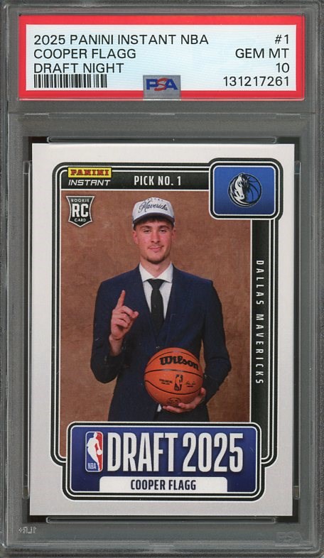 2025 Panini Instant NBA Cooper Flagg Draft Night RC #1 PSA GEM MINT 10 - A hot rookie of Flagg in PSA Gem Mint 10grade. Card and holder are problem free.
