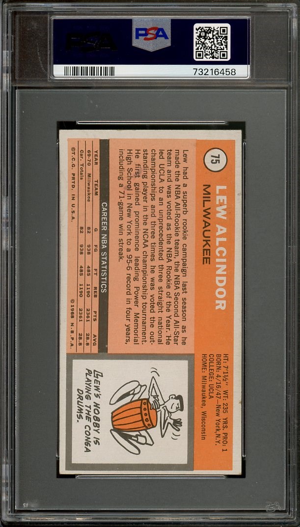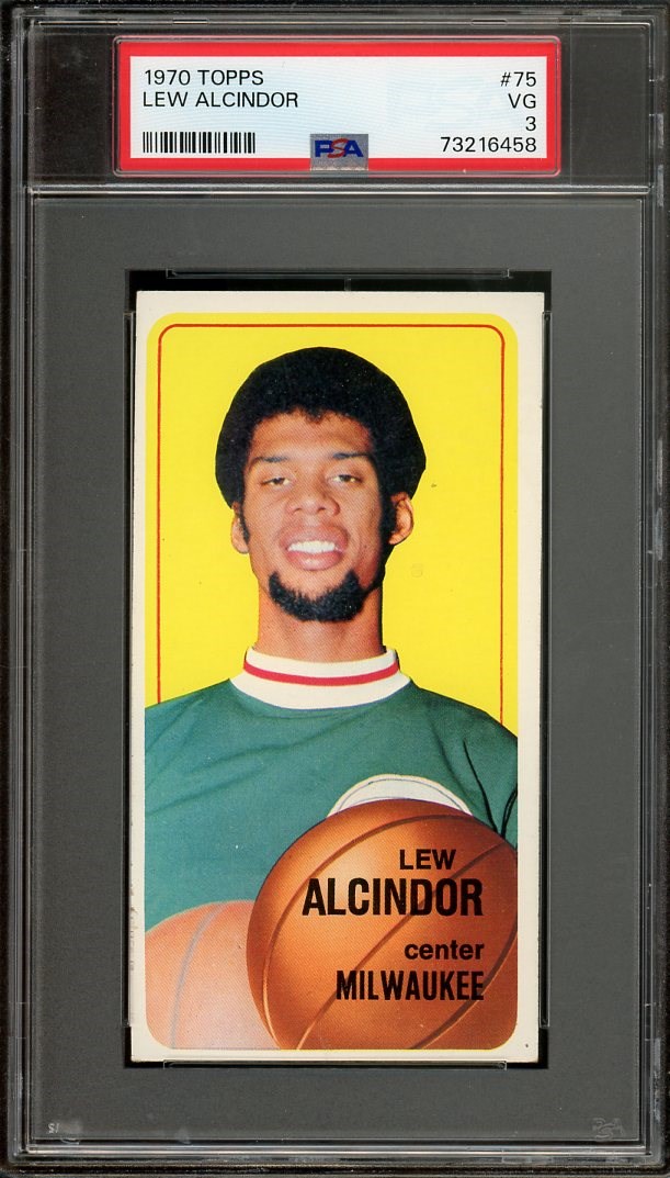 1970 Topps Lew Alcindor #75 PSA VG 3 - A very attractive card for the grade, with nice corners, original color, and great registration. The lower left edge and crease on the back make it VG.
