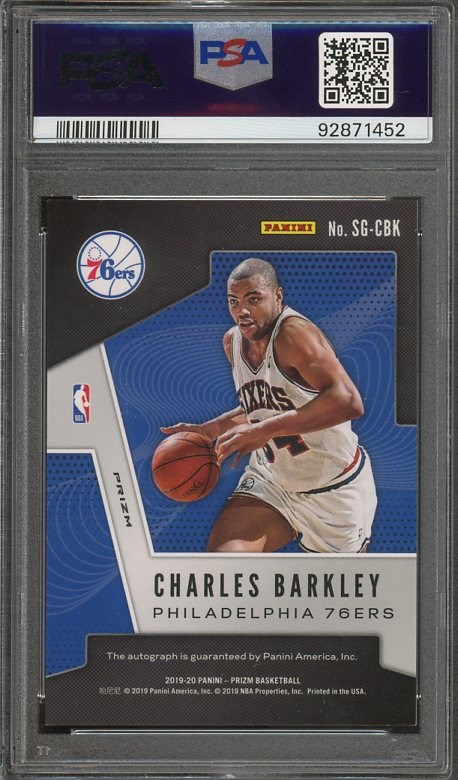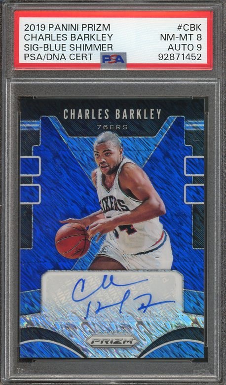 2019 Panini Prizm Charles Barkley Blue Shimmer Autograph #CBK PSA MINT 8 - One of the big personalities of the NBA, Barkley remains in the spotlight long after his NBA career. Card grades PSA NM/MT 8 with a Mint 9 autograph.