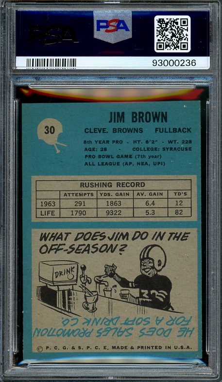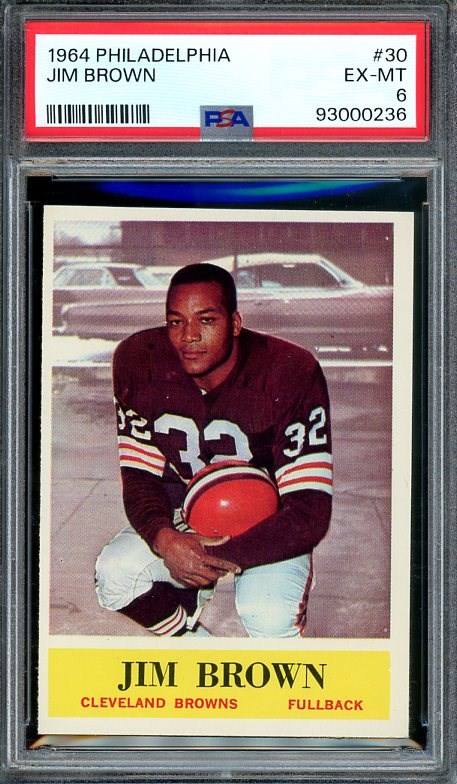 1964 Philadelphia Jim Brown #30 PSA EX/MT 6 - Brown poses in front of the car he was awarded for winning the league's MVP Award. A clean PSA 6 in a scratch free holder.