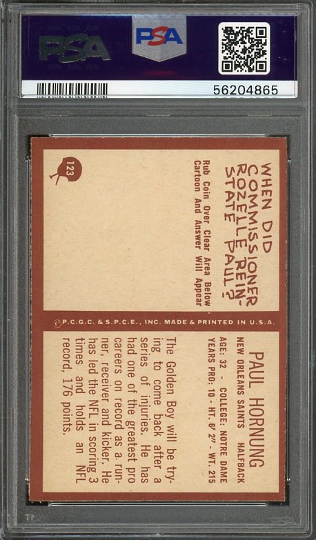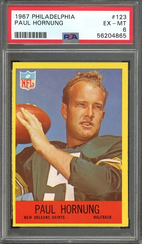 1967 Philadelphia Paul Hornung #123 PSA EX/MT 6 - Here is Packer great Paul Hornung from the 1967 Philadelphia set. A solid EX/MT 6 card from a condition sensitive set.
