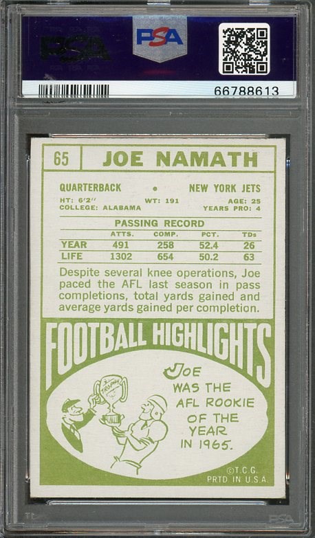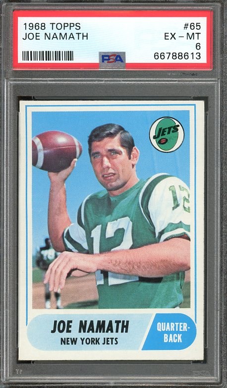 1968 Topps Joe Namath #65 PSA EX/MT 6 - Card has great corners and original color. A great early card of Namath.