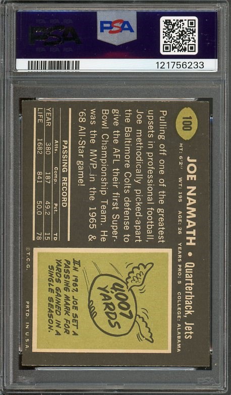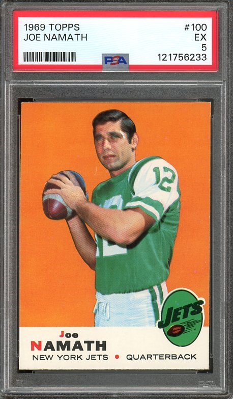 1969 Topps Joe Namath #100 PSA EX 5 - From Namath's Super Bowl winning season, this 1969 Topps has great color and registration with just enough corner wear to earn a PSA 5 grade.